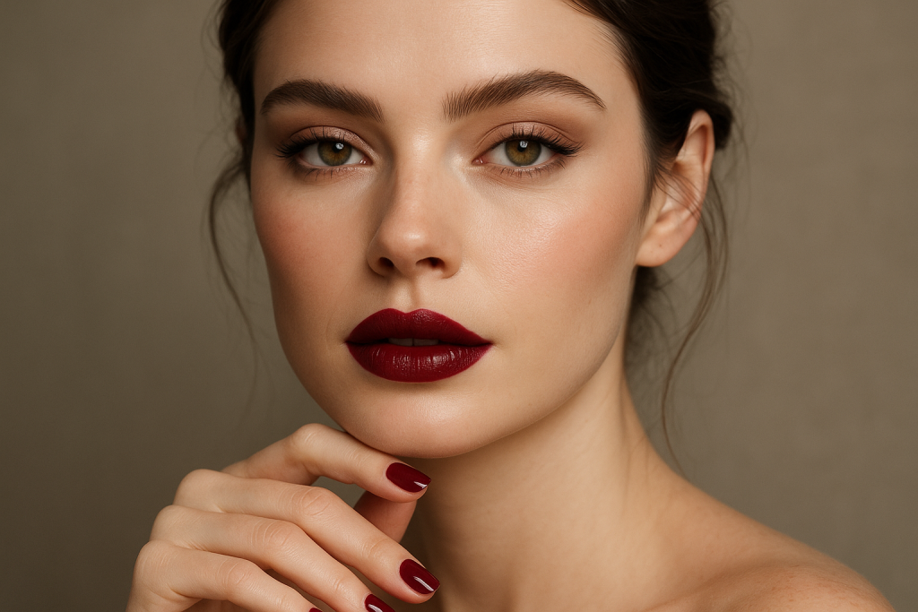 Per le labbra via libera a un rosso scuro ciliegia, elegante e deciso. Bellissima anche l’idea di abbinarlo alle unghie nella stessa tonalità.